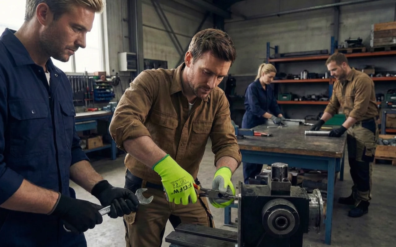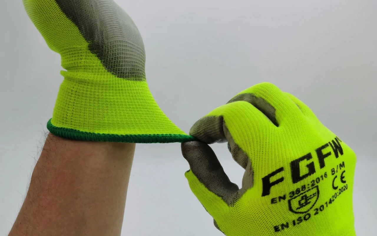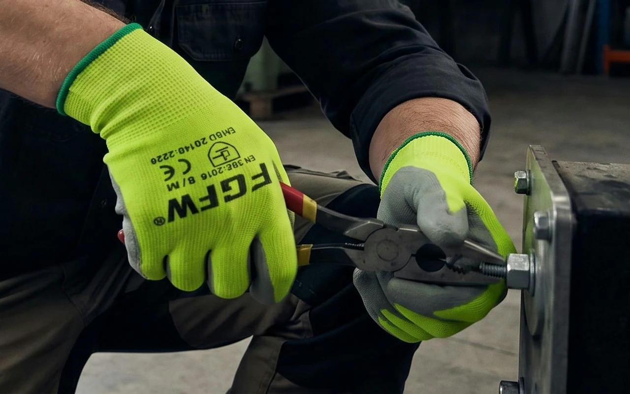 Jasně fluorescenční materiál zřetelně zvýrazňuje polohu rukou v šeru. Tým si signálů všimne okamžitě, což pomáhá předcházet nebezpečným chybám u strojů.