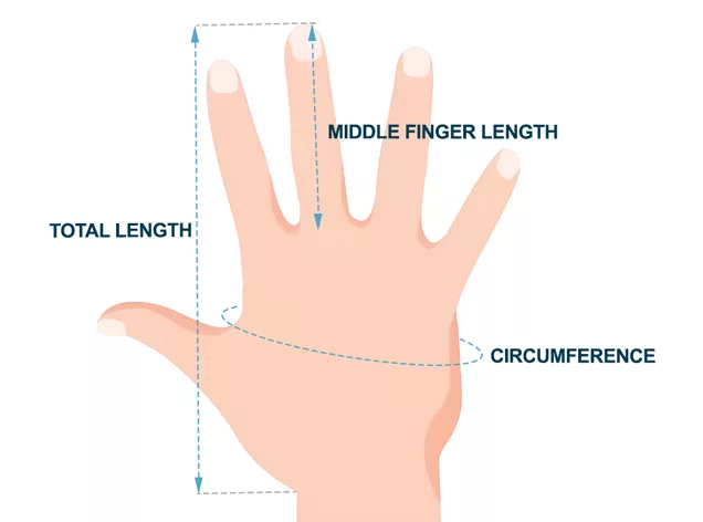 | SIZE | PALM CIRCUMFERENCE | MIDDLE FINGER LENGTH | HAND LENGTH | |||