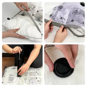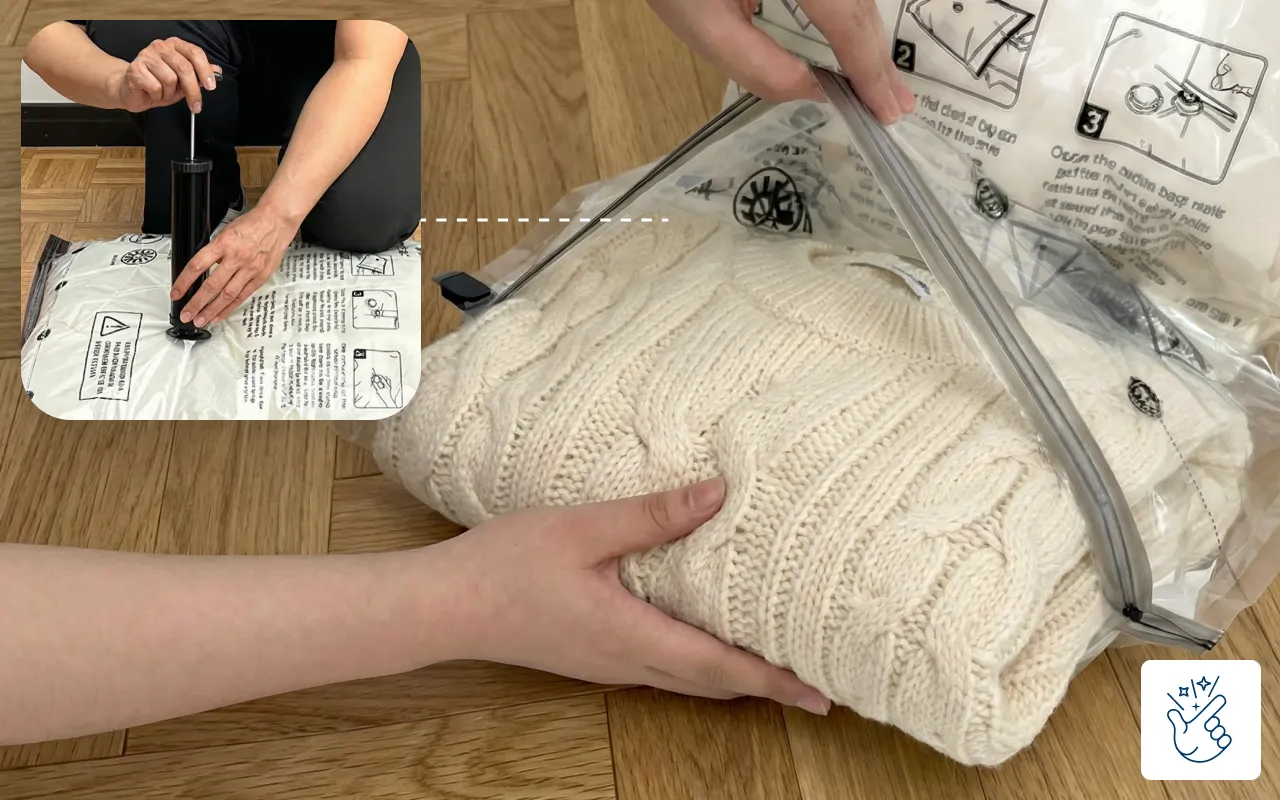 Naplňte vak Ortorex a poté pomocí pumpy rychle odsajte vzduch. Svetry a ložní prádlo se rychle sploští s minimální námahou.