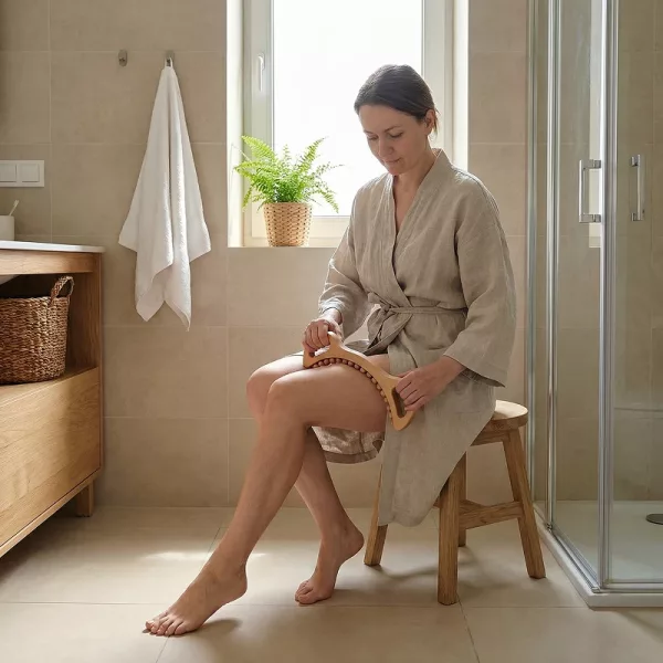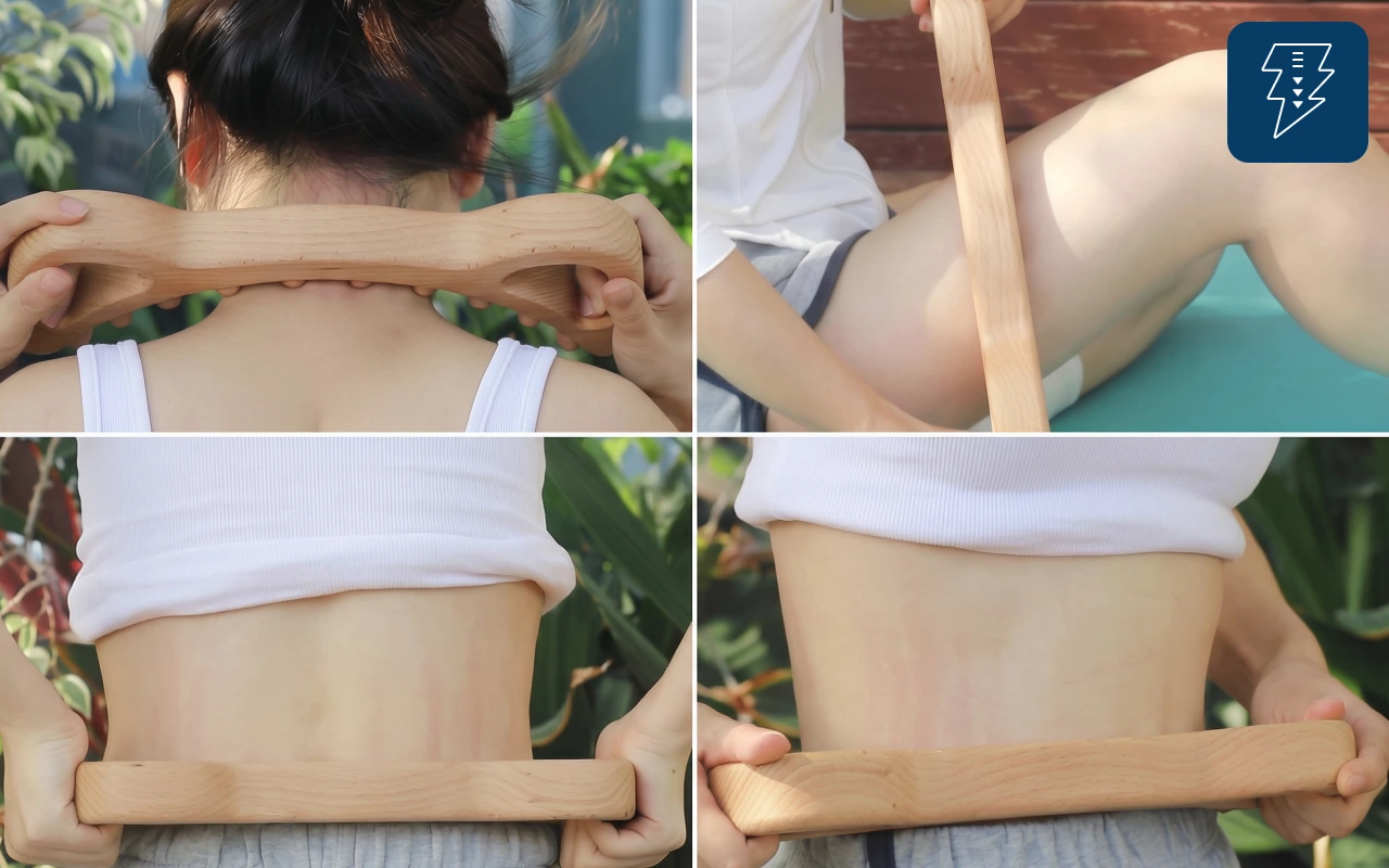 Dřevěný nástroj používám po sprše s trochou oleje. Pomáhá uvolnit kolena a kotníky a moje stehna vypadají méně oteklá.