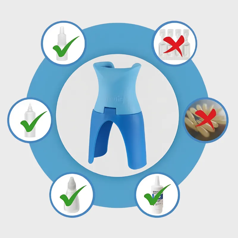 Tento dávkovač funguje s téměř každou značkou a velikostí lahvičky s očními kapkami.