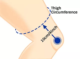 - 2. Omotejte měřicí pásku kolem nejširší části stehna asi 10cm/4" nad středem vaší čéšky.