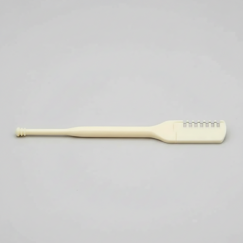 Zaoblené konce pomáhají předcházet říznutí během zastřihování chloupků. Ochranný hřeben chrání citlivou vnitřní pokožku před nechtěnými poraněními.