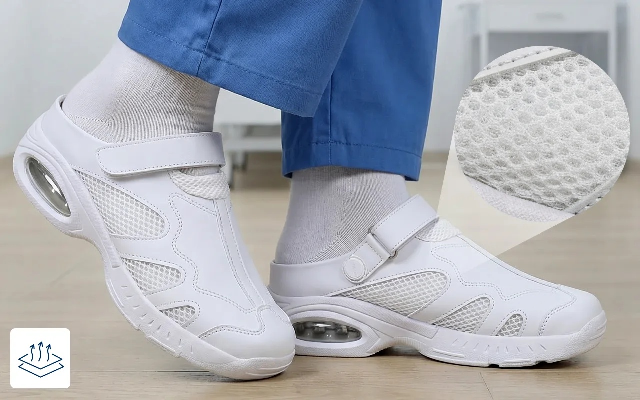Svršky ze síťoviny umožňují stálou cirkulaci vzduchu, která zabraňuje přehřívání. Nohy zůstávají suché a pohodlné po celou směnu.