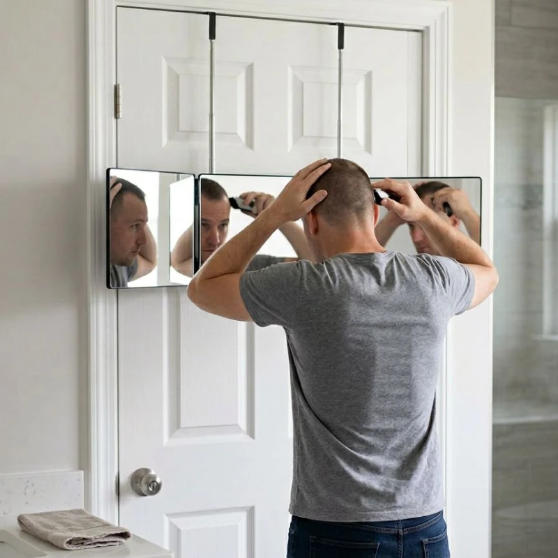 Třístranné zrcadlo mi dovoluje daleko lépe upravit vousy. Konečně vidím i zadní část hlavy bez krkolomného otáčení.
