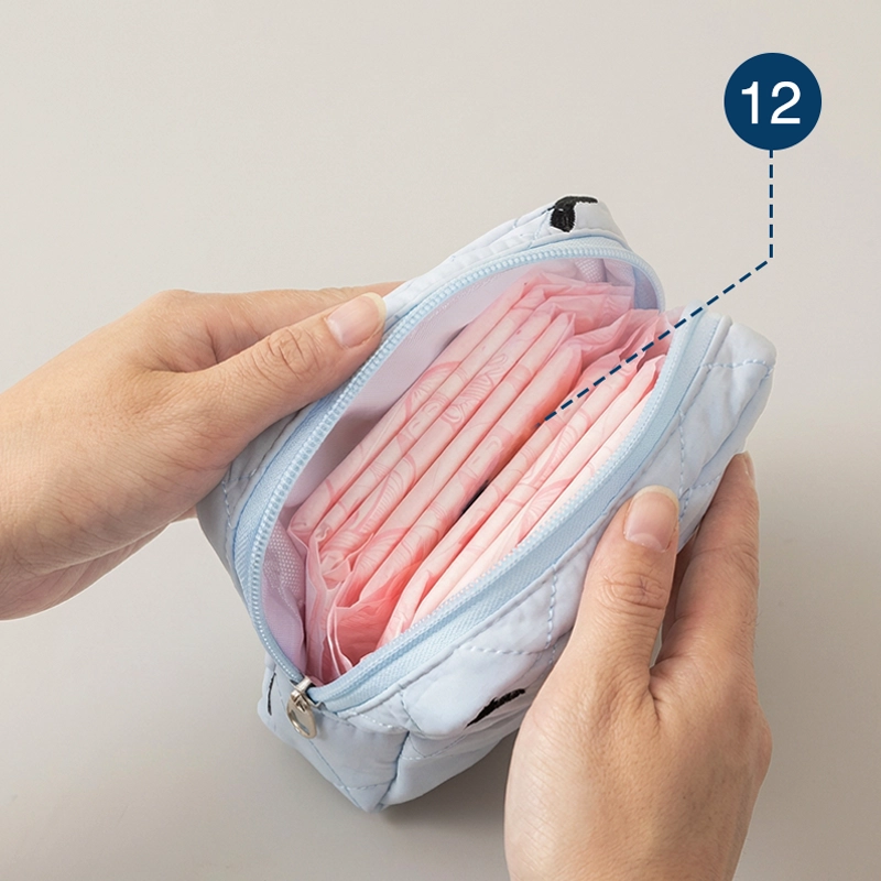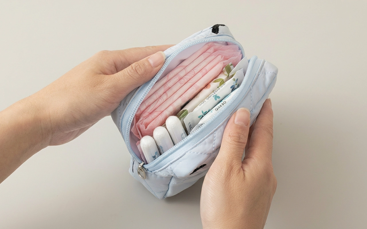 Vždy mám svůj modrý pouzdro u sebe. Vejde se do něj vložky, slipové vložky a dokonce i malý balíček kapesníků. Opravdu mi to usnadňuje školní dny.