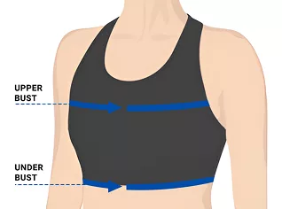 - 3. Pro změření horní části prsou omotejte měřicí pásku kolem trupu, těsně pod podpažemi a přes horní část prsou.