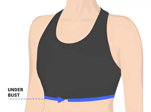 - 2. Pro změření pod prsy omotejte měřicí pásku kolem hrudníku přímo a rovnoměrně pod prsy.
