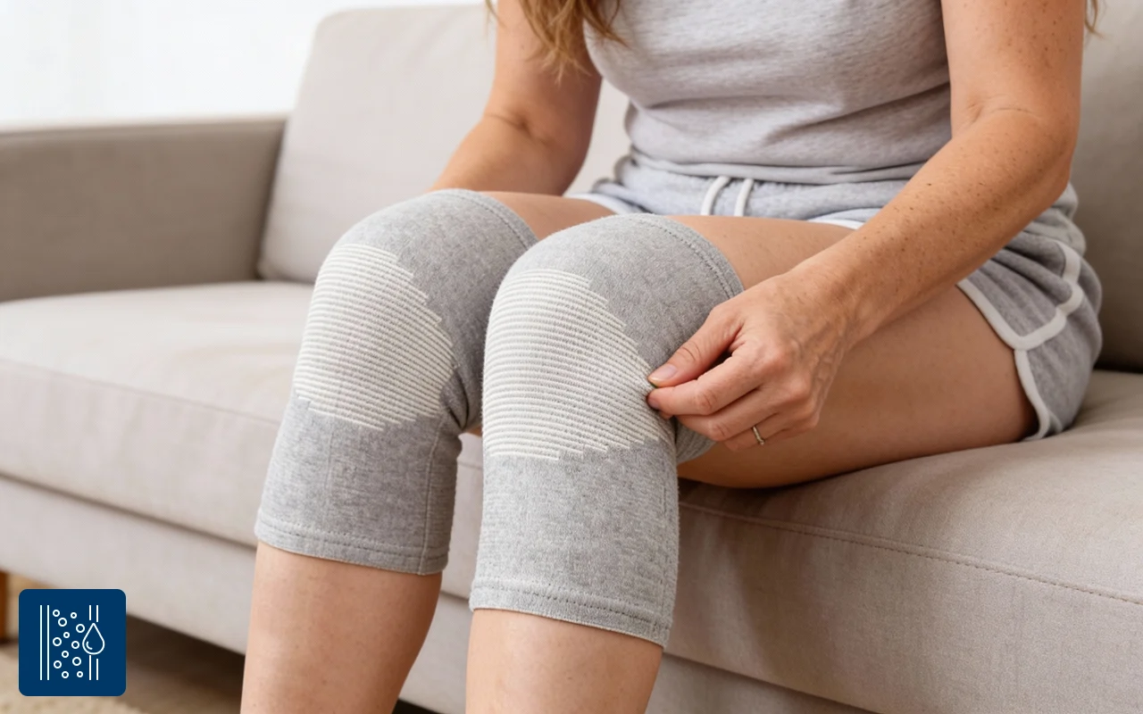 Nosím hřejivé kompresní návleky při práci z domova. Dřív mi po celodenním sezení kolena tuhla, ale teď se cítí podepřená a nezasekávají se.