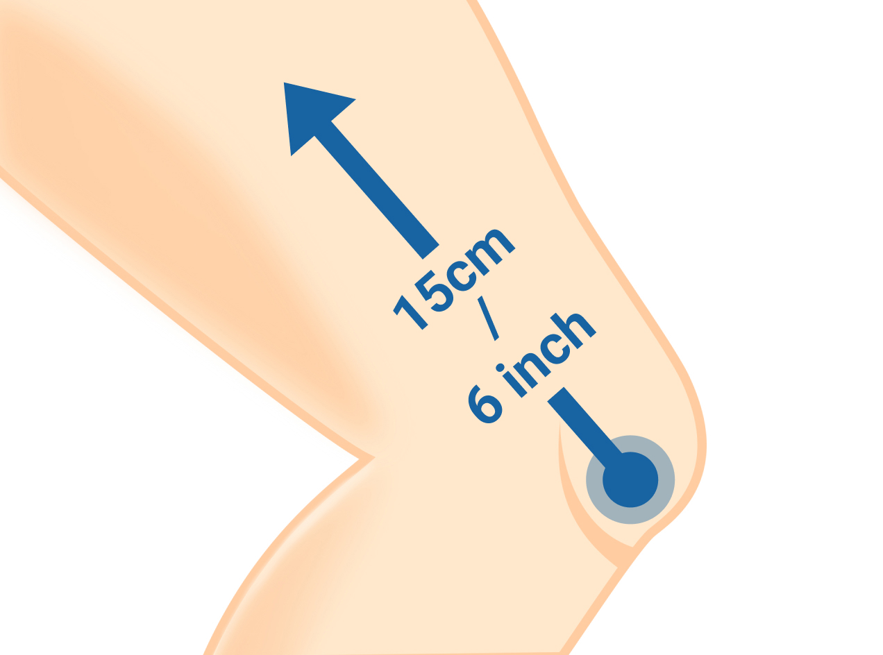 - 2. Přiložte metr 15 cm/6" nad střed čéšky a veďte ho směrem ke kotníku.