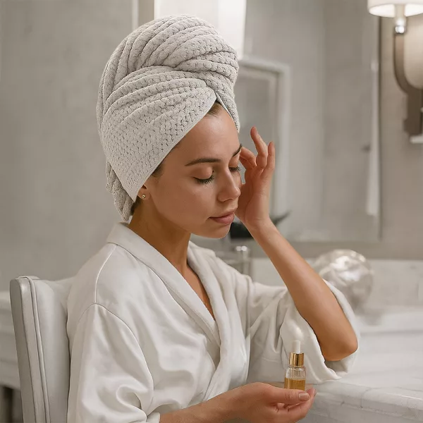 Mikrovlákno je úžasné—jemné k hlavě a vlasy schnou opravdu rychle! Už žádné mokré skvrny ani těžké ručníky padající z hlavy. Už bych se nevrátil(a) zpět.
