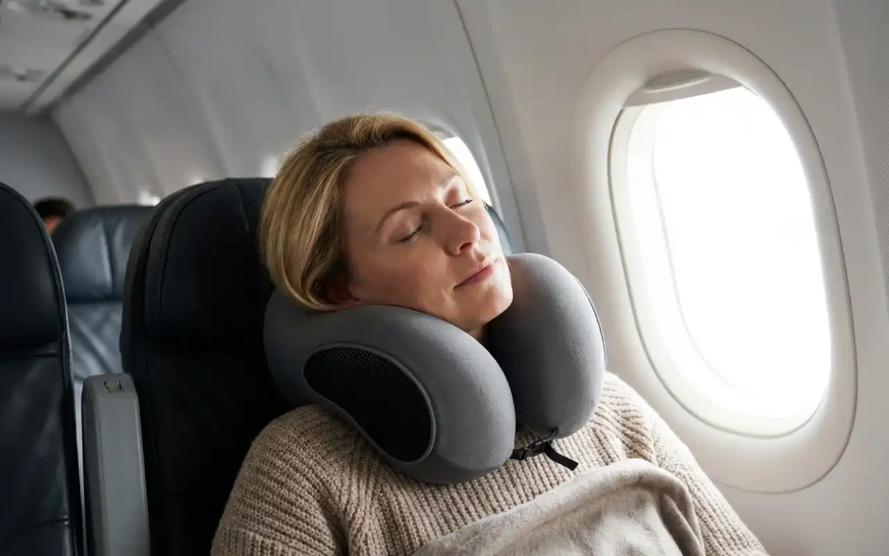 Mívám na palubě letadla bolesti hlavy, ale teď už ne! Polštář na krk mi drží hlavu, takže se vždy probouzím s dobrým pocitem.