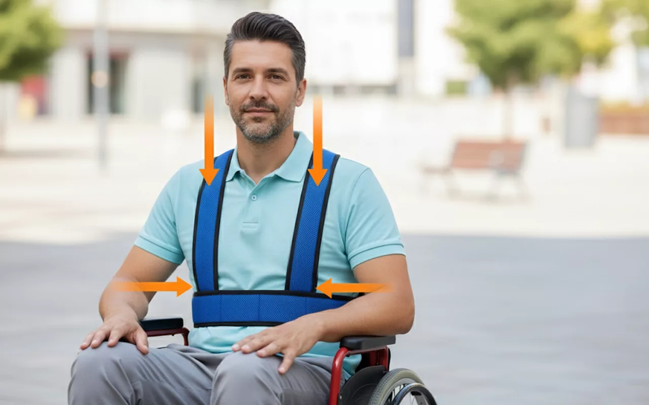 Ramenní popruhy udržují lidi ve vzpřímené a stabilní poloze během používání. To pomáhá předcházet nebezpečným uklouznutím nebo předklonům v křesle.