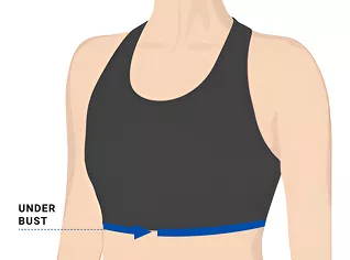 - 2. Pro zjištění obvodu pod prsy omotejte měřicí pásku kolem hrudního koše přímo a rovnoměrně pod prsy.