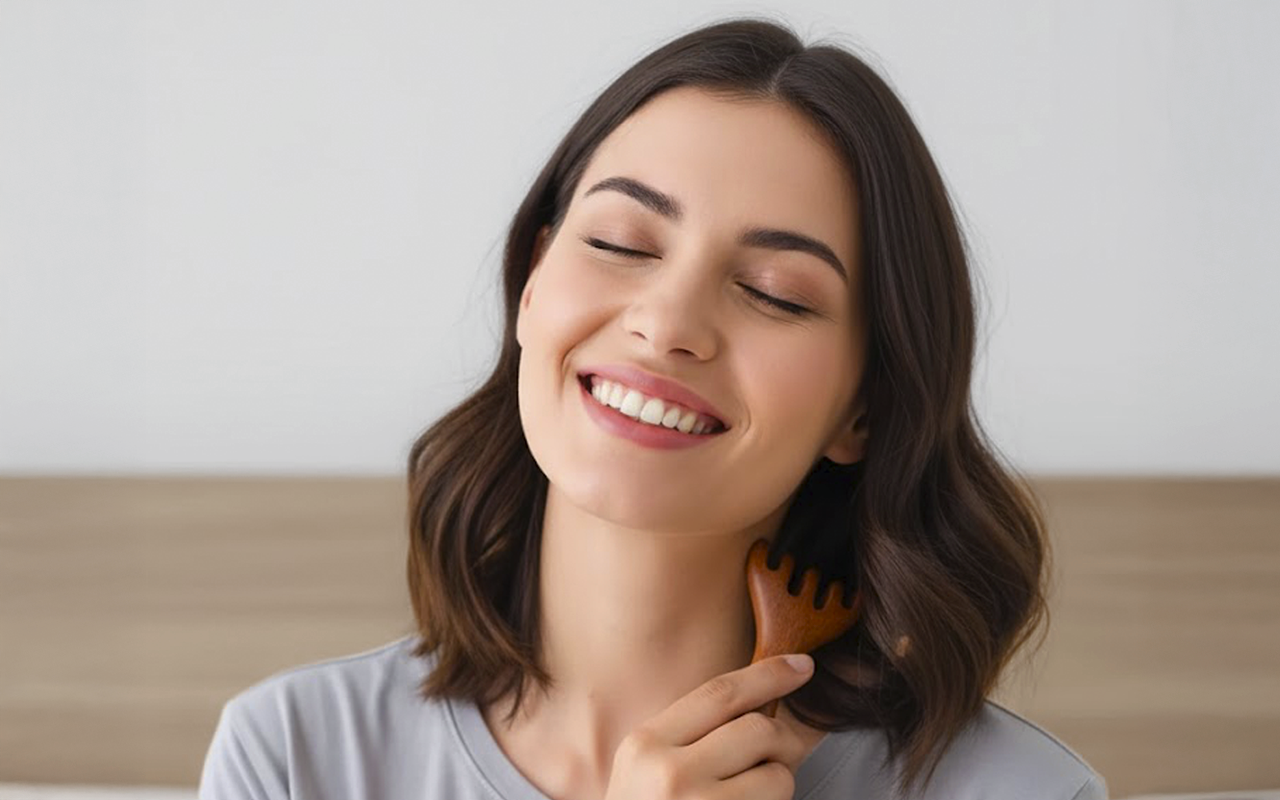 Jemné, zaoblené zuby masírují pokožku a uvolňují napětí. Pociťte osvěžení, jak se s každým tahem stres odplavuje.