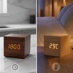 Kostkový budík vypadá skvěle na mém nočním stolku. Miluji probouzení se třemi budíky a kontrolu teploty každé ráno. Ovládání je taky velmi snadné!
