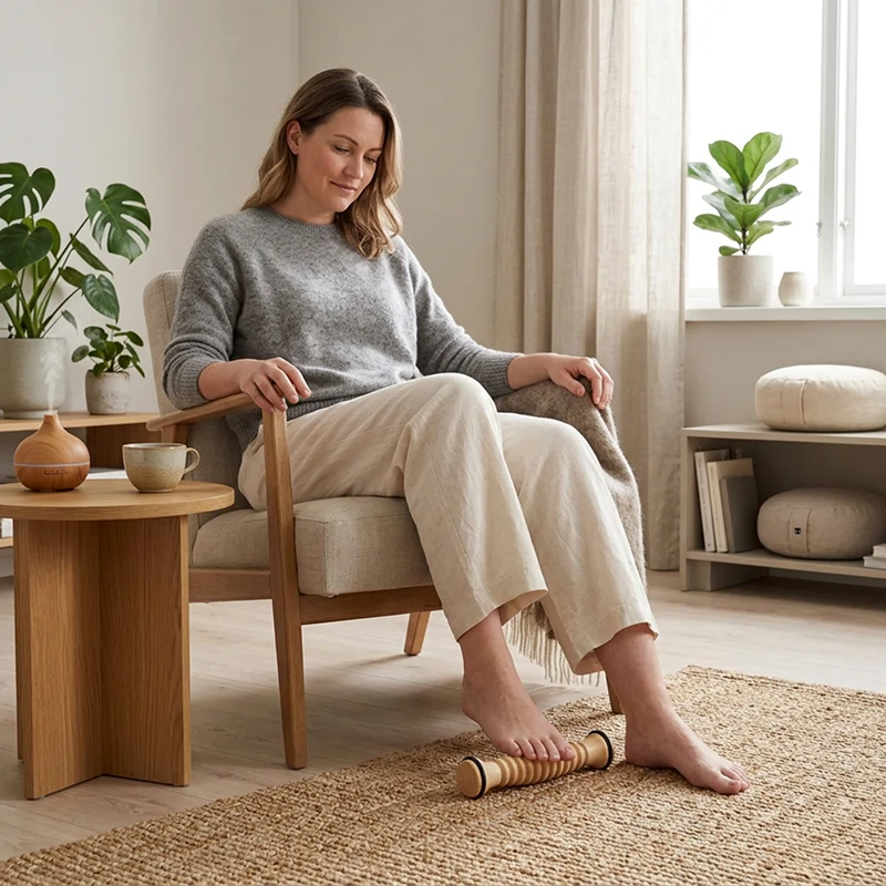 Mám tento dřevěný váleček pod stolem a používám ho během pracovních hovorů. Zklidňuje bolest paty a zanechává moje chodidla teplá a uvolněná.