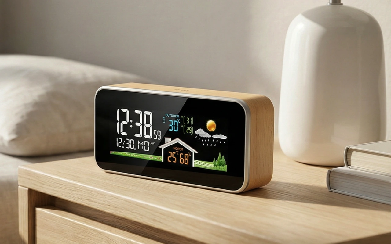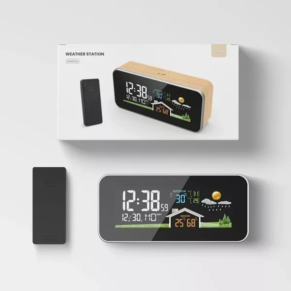 Objednal jsem si dřevěné hodiny do domácí kanceláře. Nastavitelný jas je praktický při práci pozdě do noci a ukazatel teploty mi pomáhá cítit se pohodlně.